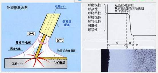 圖1所示的是(堆焊,涂層)的示意圖及各種特性。A區(qū)是堆焊到工件表面的涂層或堆焊層,由于與母材之間產(chǎn)生了合金化作用,向工件內(nèi)部擴(kuò)散,熔滲,形成了擴(kuò)散層B,得到了高強(qiáng)度的結(jié)合.